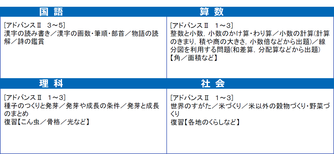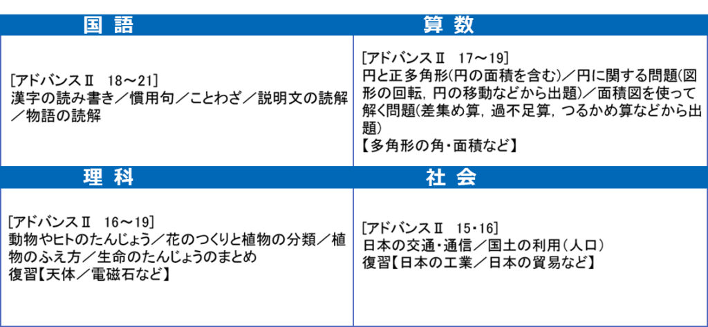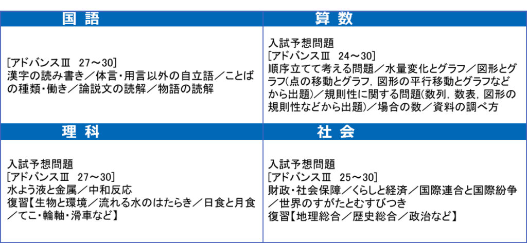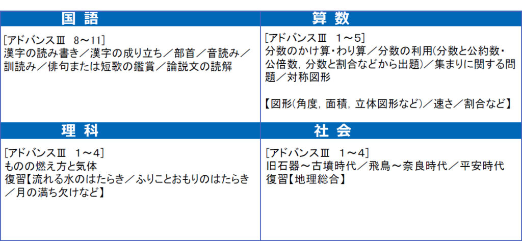 11月模試の学年ごと・各科の出題範囲は以下の通りとなります。
